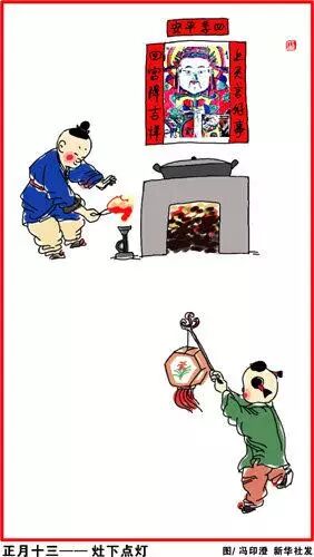 正月十三,灶下点灯。预放元宵,自十三日起,巷陌桥道,皆编竹张灯。