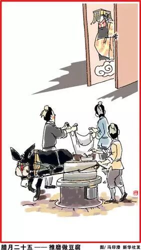 腊月二十五,推磨做豆腐。传说玉帝会下界查访,吃豆腐渣以表清苦。