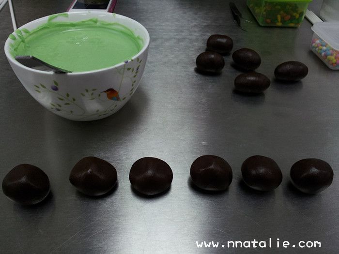 把多餘份量甩掉,快速插進巧克力球中間且突出1cm左右