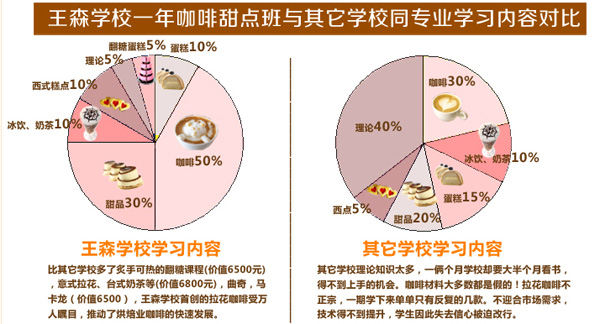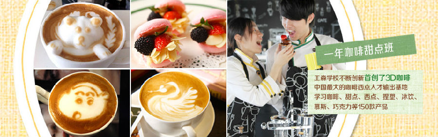 王森学校与“咖啡陪你”强强联手推出一年咖啡陪你专业。相关课程囊括冰饮、奶茶、咖啡、甜点、翻糖/蛋糕、西点/西餐等,以咖啡甜点为主,并涉及蛋糕、西点、西餐行业,且附加价值6500的翻糖课程。王森学校与韩国第一咖啡品牌咖啡陪你联手,成为其指定输出人才基地。