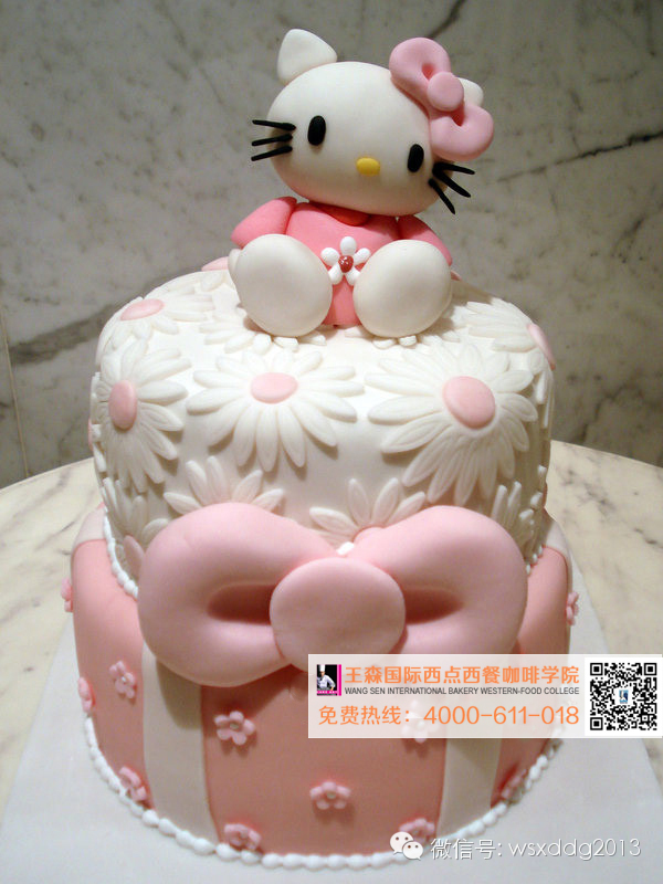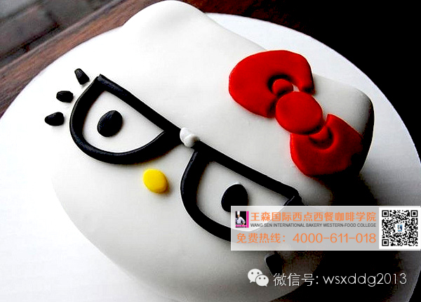 通过用翻糖包面,再弄个蝴蝶结、眼镜、小鼻子、小胡须,俨然一个大头kitty就显现了,记得王森学校顾老师曾问跟学生说过:翻糖蛋糕最重要的一步就是考究你包面技术,面身是否光滑,是影响你接下来所有的操作过程。