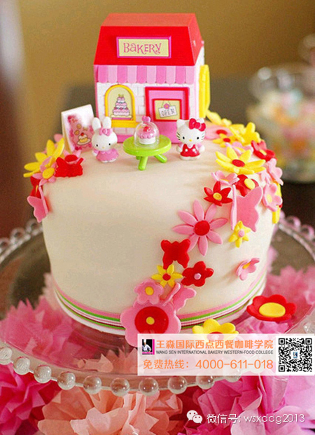 这是个纯粹的翻糖蛋糕,花朵,粉嫩粉嫩的小Hello Kitty、小白兔糖公仔,小房子,花边,都是翻糖制作的,这个10天翻糖专科班的作品,看似简单,真正制作起来还是比较费神的!