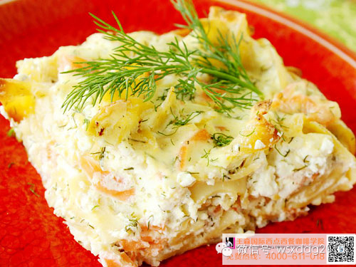 【烟熏三味鱼奶酪千层面】将奶油与千层面混合,会让人联想起常吃的甜甜圈百吉饼,而加入烟熏三文鱼之后,这道菜有了更丰富的层次感,作为早午餐,也是不错的选择。