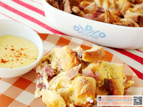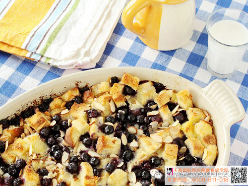 【蓝莓奶油面包混合布丁】将面包切成小颗粒,与新鲜的蓝莓混合在一起,加以丰富的奶油,烤制出的这道布丁早餐,平衡了新鲜水果与面包的味道,融化在口中时已经成为经典。