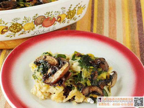 【三味素菜锅】全素的食材,却在烘焙中充满了热情,大量的蘑菇与菠菜混合,以韭菜提取两者的芳香,烤制成功后撒上些芝麻,是一道非常健康的素食早餐。