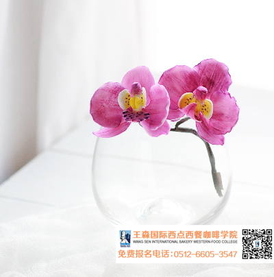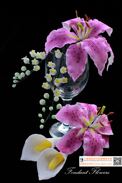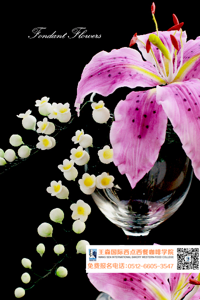 2001年王森咖啡西点学校开始研发翻糖,那时,我便开始做翻糖,偏爱花朵造型。先后做过玫瑰,亚洲百合,香水百合,铃兰,牡丹,梅花和樱花等等。自 2001在英式和美式翻糖蛋糕的基础上,我结合了中国传统的艺术技法,于苏州王森咖啡西点学校研发出了具有中国风格的翻糖蛋糕系列,并开始从事翻糖蛋糕教 学工作。放假归来,重新执起沉甸甸的翻糖专用“擀面杖”(rolling pin),竟有一种归隐多年重出江湖的感觉。一手横持rolling pin,另一手情不自禁地以食指和中指掐了个剑诀,沿着杖身掠过。听来挺滑稽的,实际的感觉有些庄严的意思。借着新年气息,迅速找寻记忆里的东西,于是一 束兰花傲然枝头。那些细节,那些方子里不能记录的手法,在制作中全部重新回到指尖。凭指尖去触摸和创造的感觉,很好。