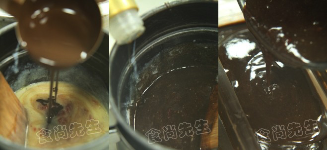 4.加入融化好的黑巧克力调匀,搅拌的时候要匀速,避免充入多余的气泡。