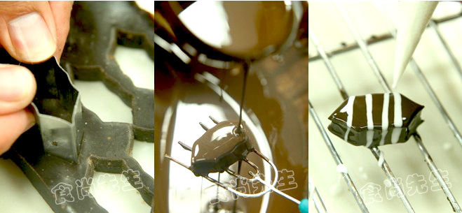 9.待巧克力没有干的时候,用白色巧克力画上线条,然后用牙签轻轻的划出纹路。