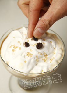 6.用咖啡豆和砂糖粒装饰表面即可。