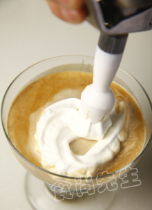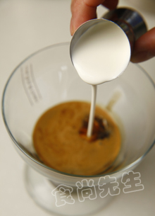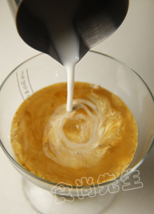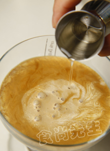 3. 将低脂鲜奶倒入钢杯,加热至约65℃后,注入杯中。