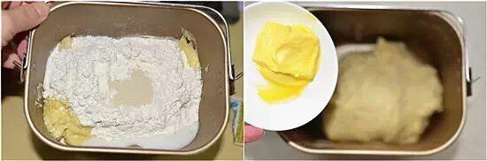 3、面团材料除黄油外,与卡仕达酱一起放进面包机桶中开始揉面。