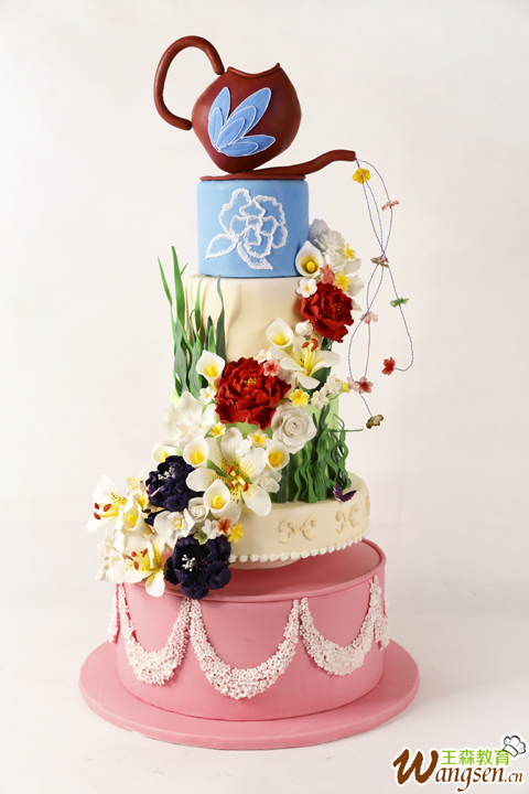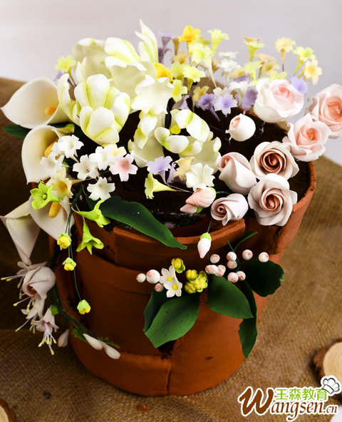 是不是好多伙伴们以为这是真的花盆呀?大家可千万别被表面现象迷惑哦~这完完全全是一个翻糖作品!学员将翻糖以花团锦簇的样式展现出来,向我们证明这实力简直无懈可击!