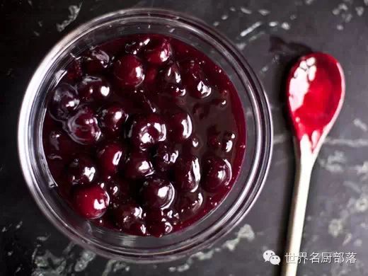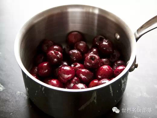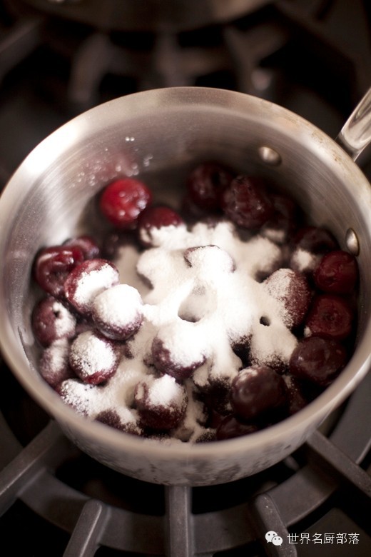 糖和樱桃搅拌好,低火加热直到樱桃煮沸,液体变粘稠,变得透明,约10分钟。如果用的新鲜樱桃,你需要让他们先煮软。