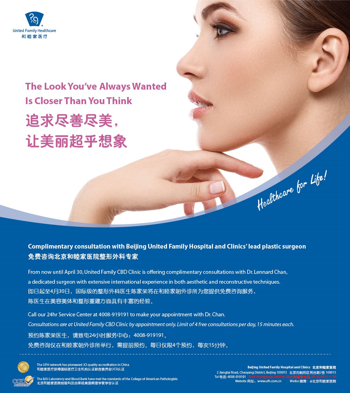 即日起至4月30日,国际级的整形外科医生陈家荣将在和睦家朝外诊所为您提供免费咨询服务,陈医生在美容美体和整形重建方面具有丰富的经验。