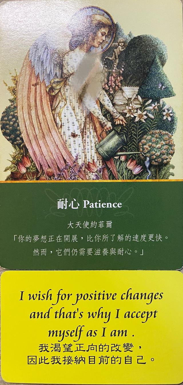 指引:当你拥有足够耐心去面对你当前的生活的时候,你会发现似乎做事,也是那么让人觉得安心和喜悦的。而你很有耐心的做一件事,专注在事件中,也能让你安静下来,内在的情绪得到舒缓和释放。
