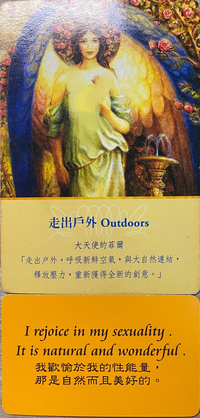 指引:今天,记得到户外走走哦,去呼吸下新鲜空气,和大自然做链接,感觉新鲜的能量进入你的身体让你慢慢的放松下来。对你来讲,你需要来到户外来释放和清理你内在的能量。