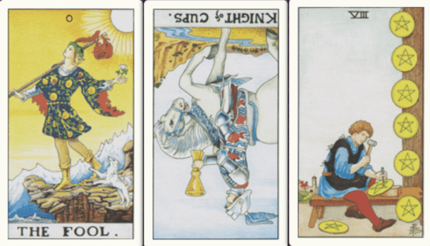 卜牌:愚人+ 圣杯骑士- 星币八+