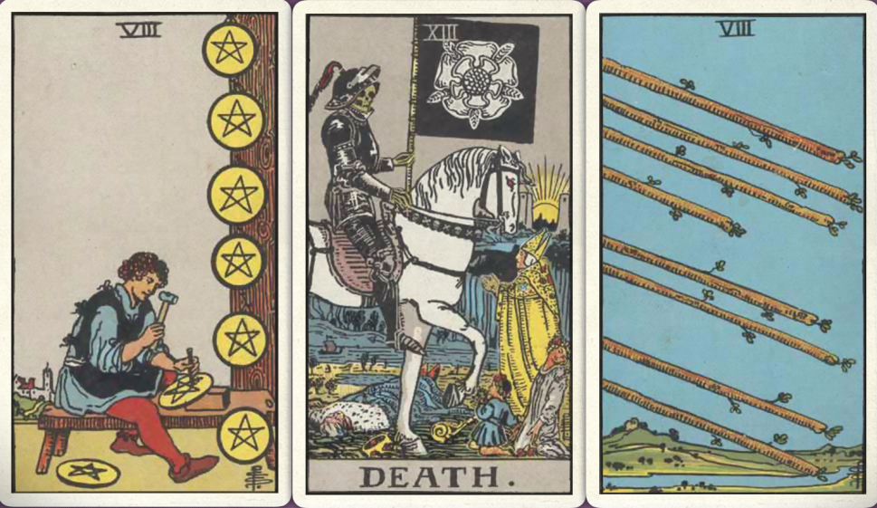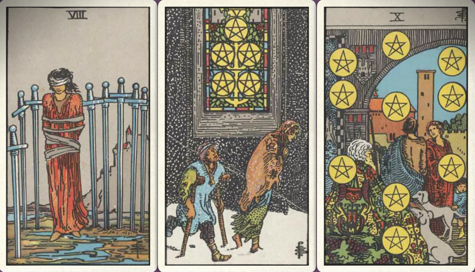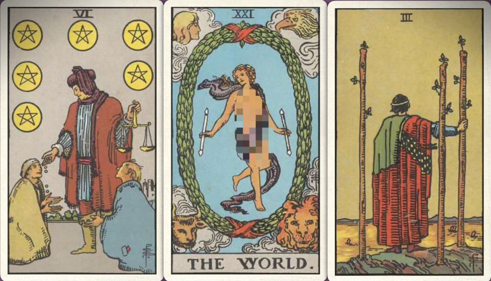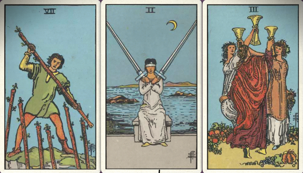 卜牌:权杖七+ 宝剑二+ 圣杯三+
