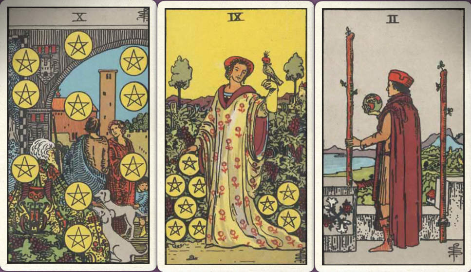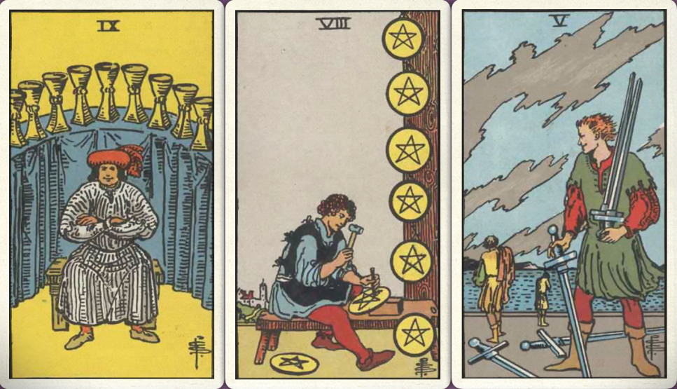 卜牌:圣杯九+ 星币八+ 宝剑五+