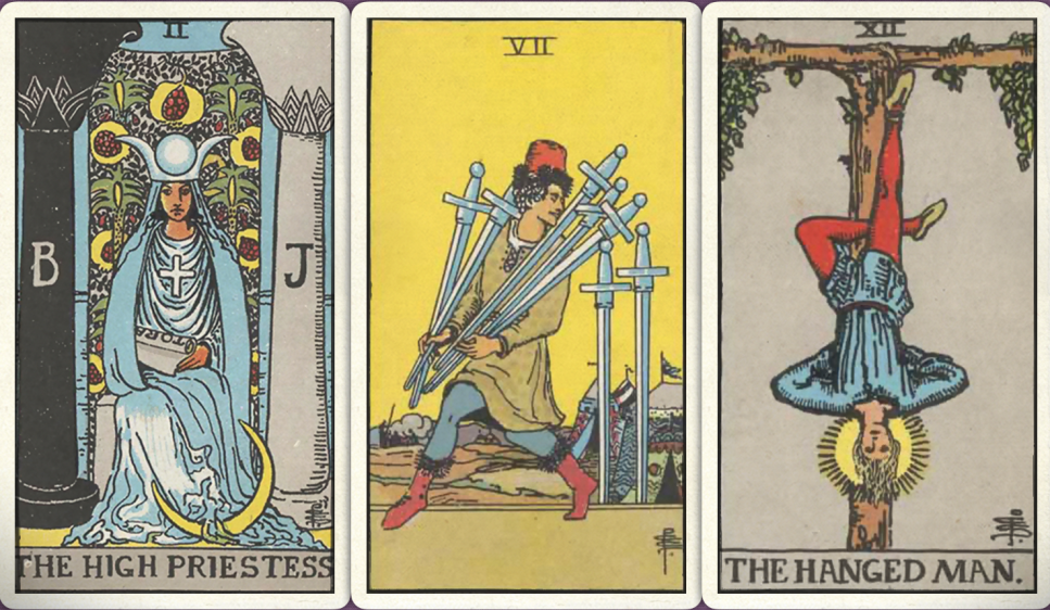 卜牌:女祭司+ 宝剑七+ 倒吊人+
