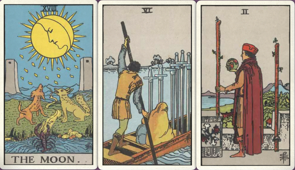 卜牌:月亮+ 宝剑六+ 权杖二+