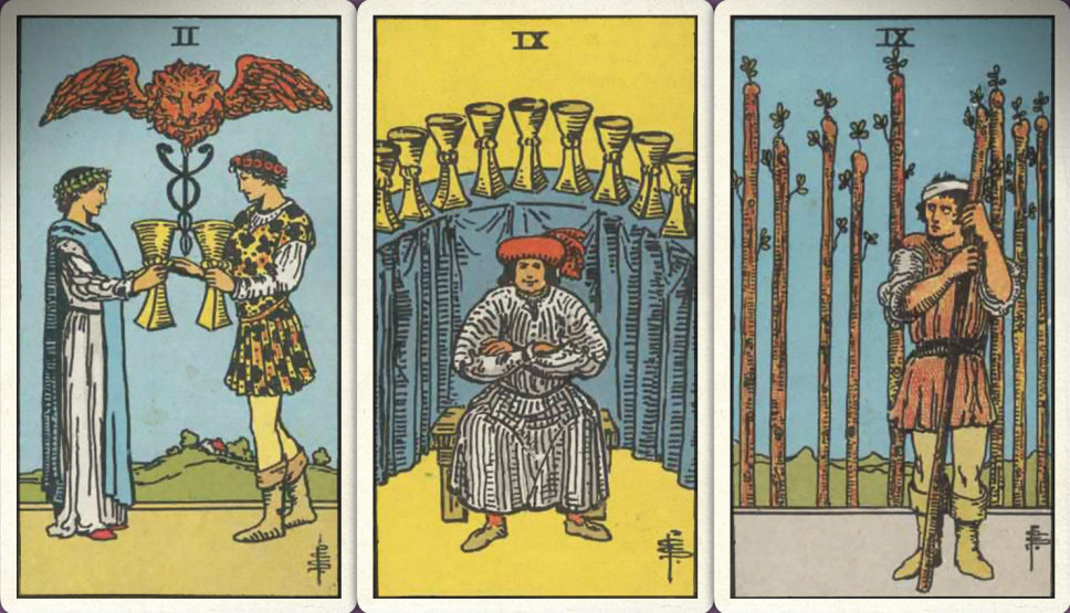 卜牌:圣杯二+ 圣杯九+ 权杖九+