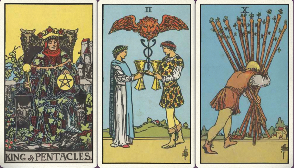 卜牌:星币皇帝+ 圣杯二+ 权杖十+