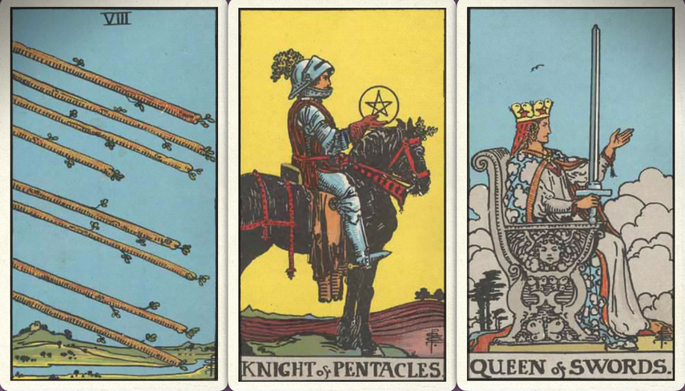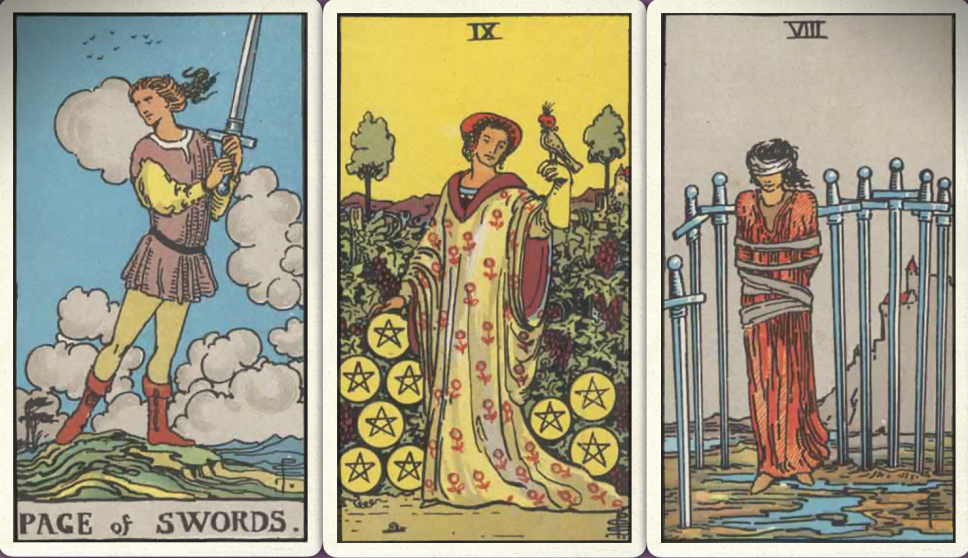 卜牌:宝剑侍从+ 星币九+ 宝剑八+