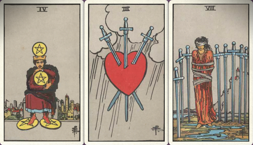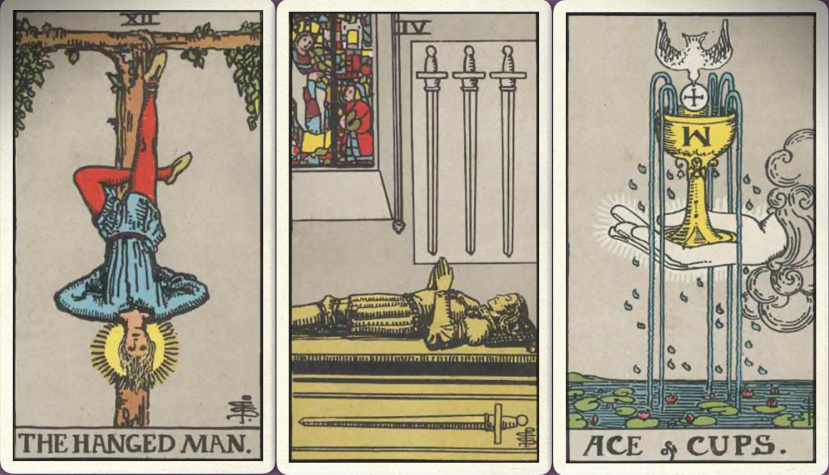 卜牌:倒吊人+ 宝剑四+ 圣杯首牌+