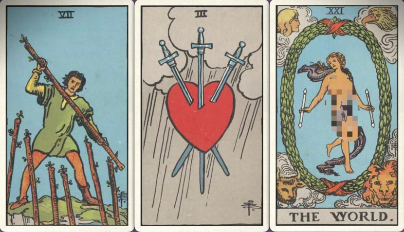 卜牌:权杖七+ 宝剑三+ 世界+
