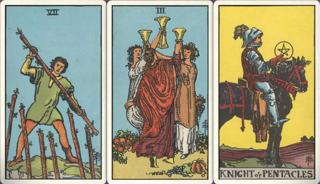 卜牌:权杖七 圣杯三 星币骑士