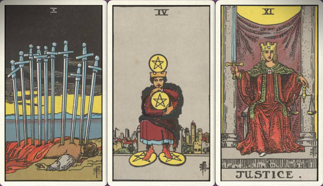 卜牌:宝剑十 星币四 正义