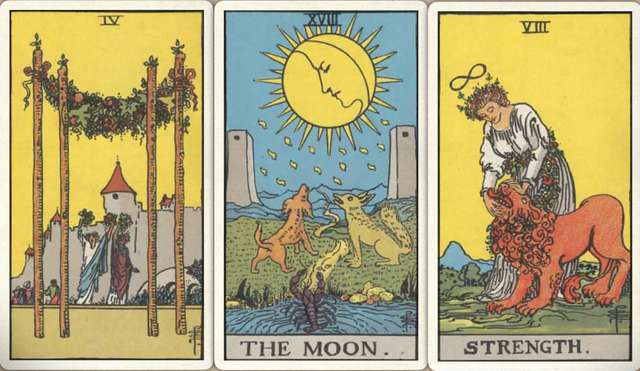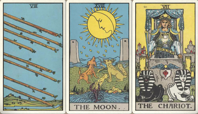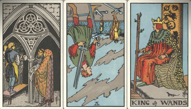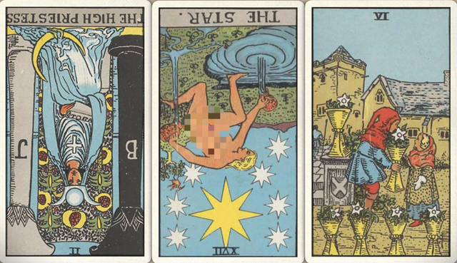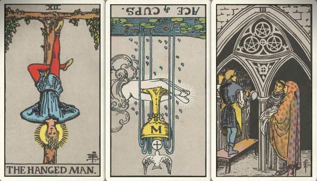 卜牌:倒吊人+ 圣杯首牌- 星币三+