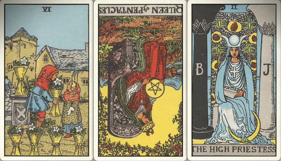卜牌:圣杯六+ 星币皇后- 女祭司+