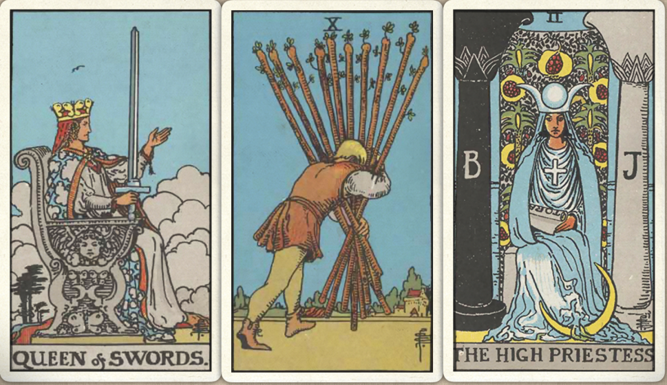 卜牌:宝剑皇后+ 权杖十+ 女祭司+