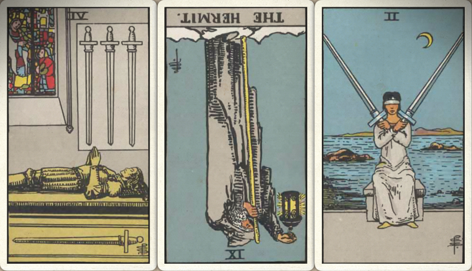 卜牌:宝剑四+ 隐士- 宝剑二+