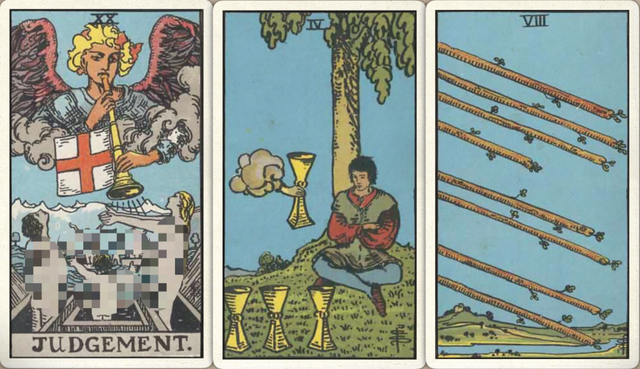 卜牌:审判 圣杯四 权杖八