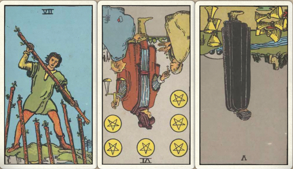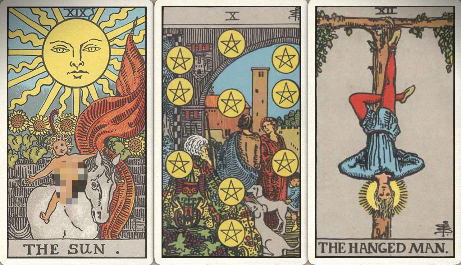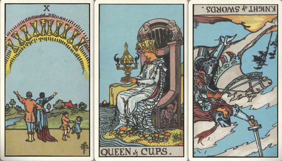 卜牌:圣杯十+ 圣杯皇后+ 宝剑骑士-