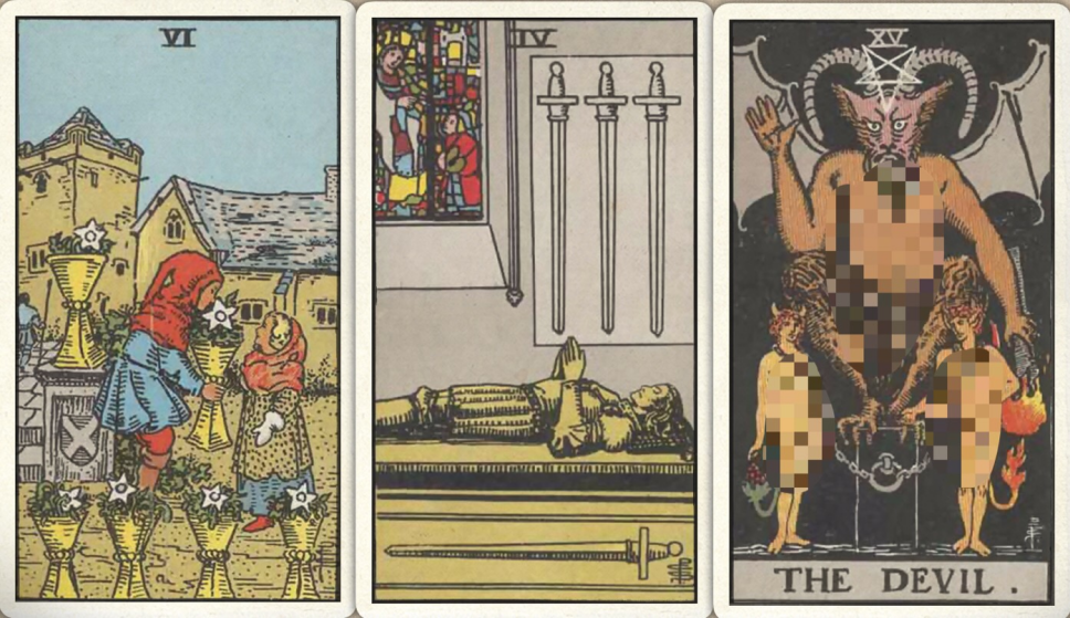 卜牌:圣杯六+ 宝剑四+ 恶魔+