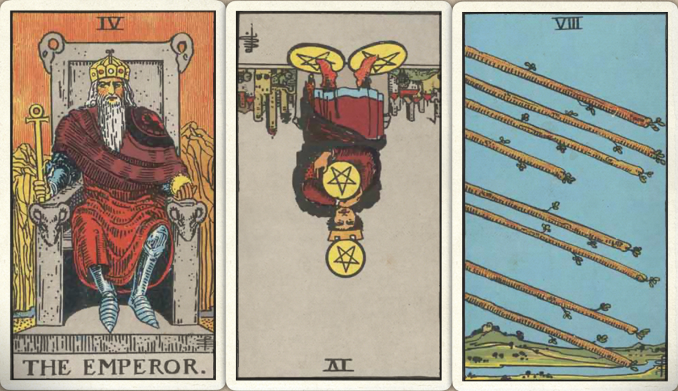 卜牌:皇帝+ 星币四- 权杖八+