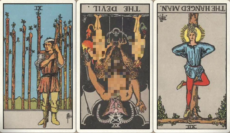 卜牌:权杖九+ 恶魔- 倒吊人-
