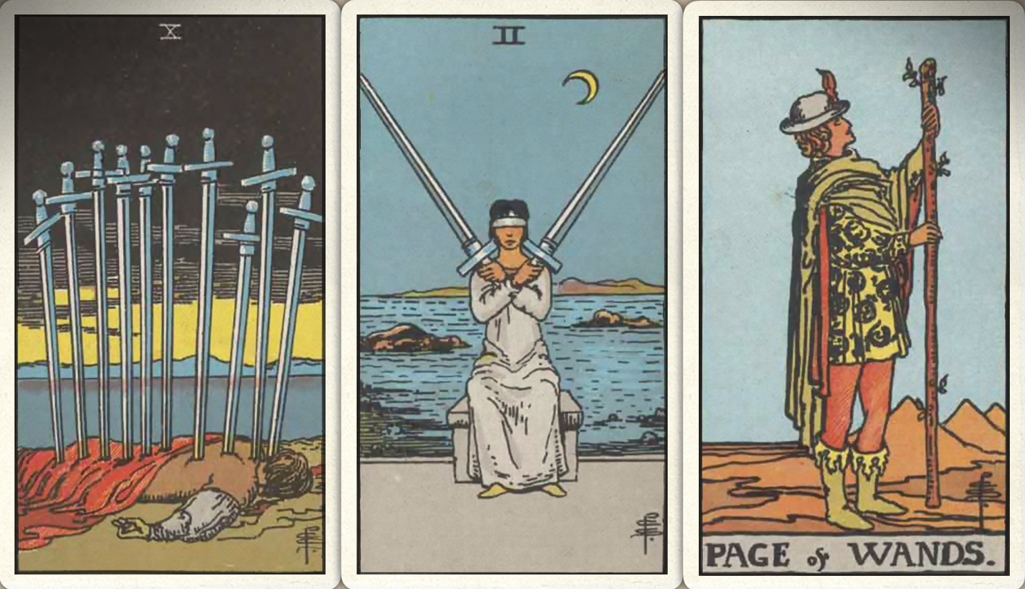 卜牌:宝剑十+ 宝剑二+ 权杖侍从+