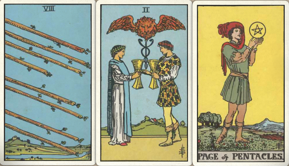 卜牌:权杖八+ 圣杯二+ 星币侍从+
