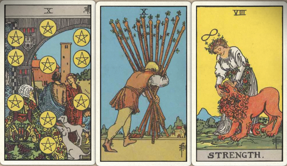 卜牌:星币十+ 权杖十+ 力量+