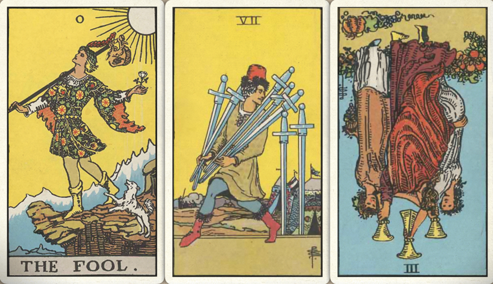 卜牌:愚人+ 宝剑七+ 圣杯三+