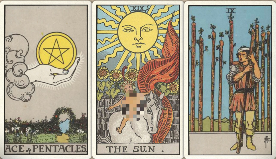 卜牌:星币首牌+ 太阳+ 权杖九+