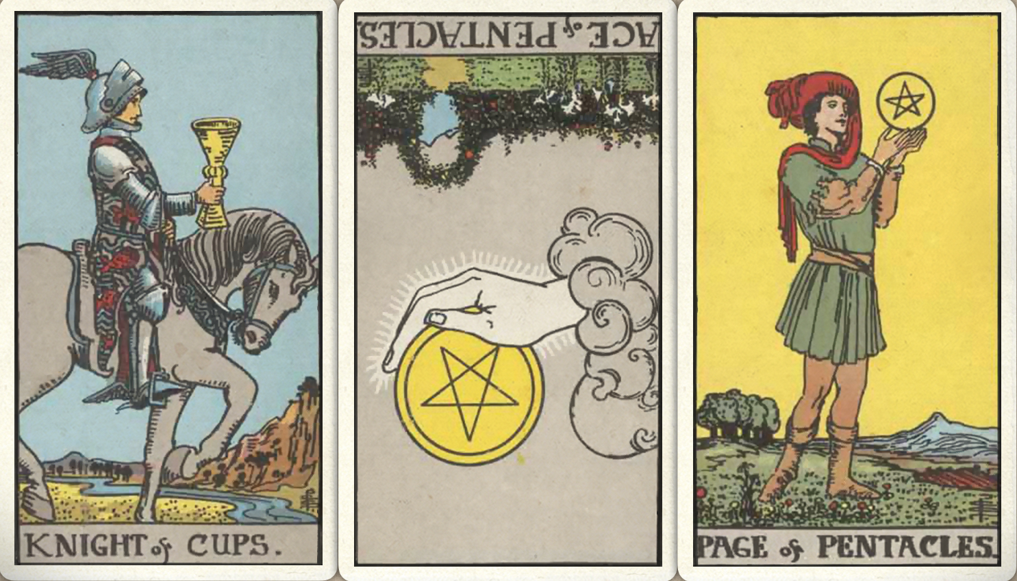 卜牌:圣杯骑士+ 星币首牌- 星币侍从+