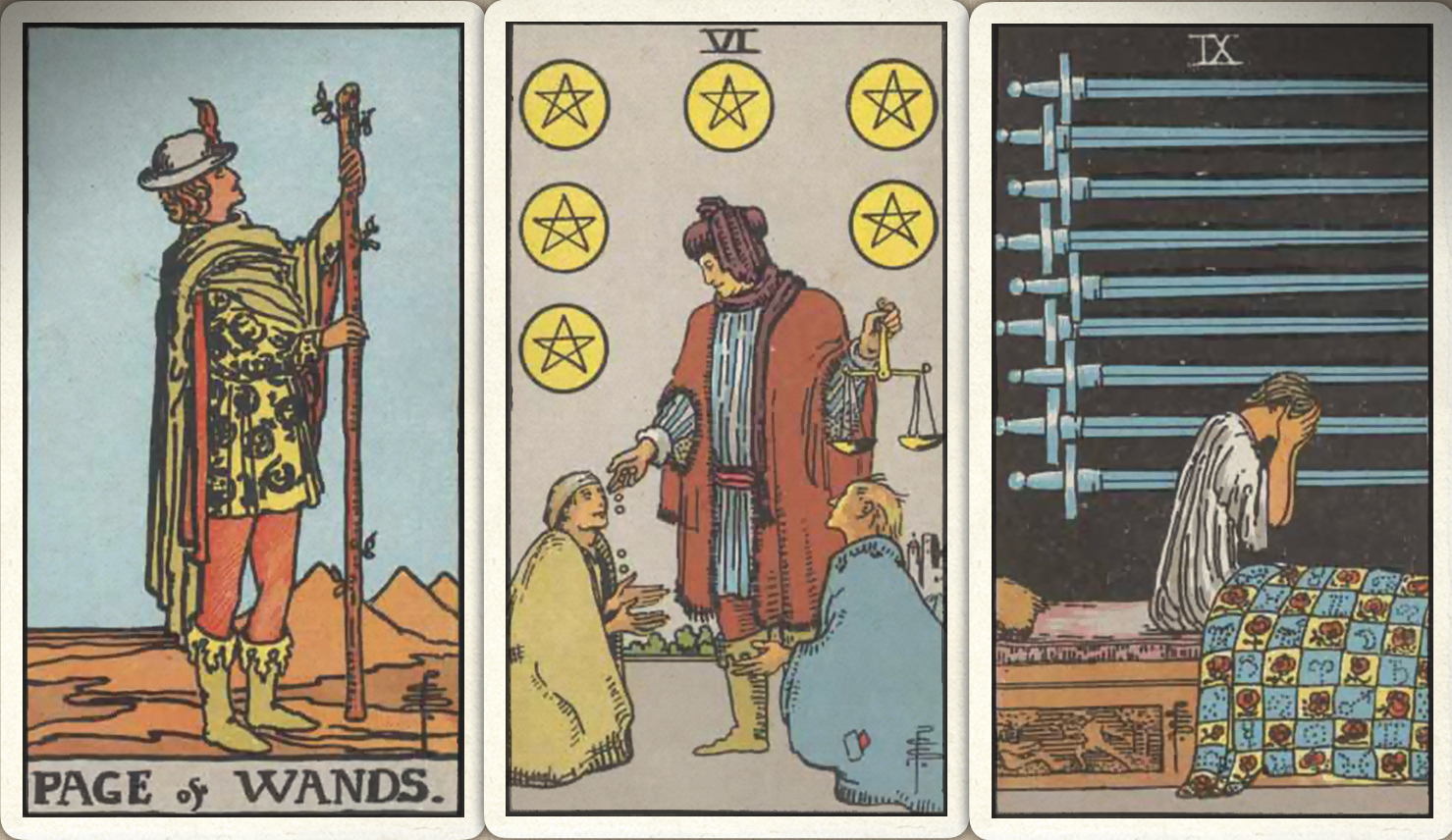 卜牌:权杖侍从+ 星币六+ 宝剑九+