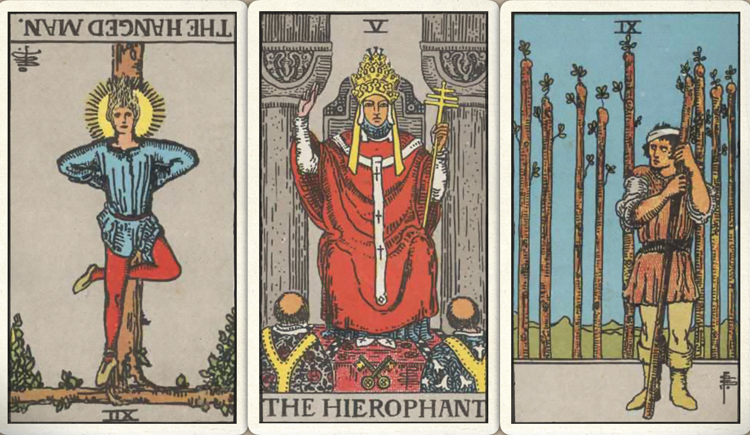 卜牌:倒吊人- 教皇+ 权杖九+