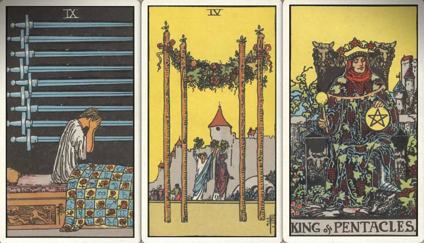 卜牌:宝剑九+ 权杖四+ 星币皇帝+